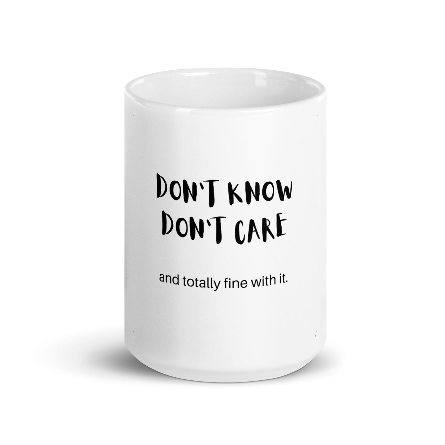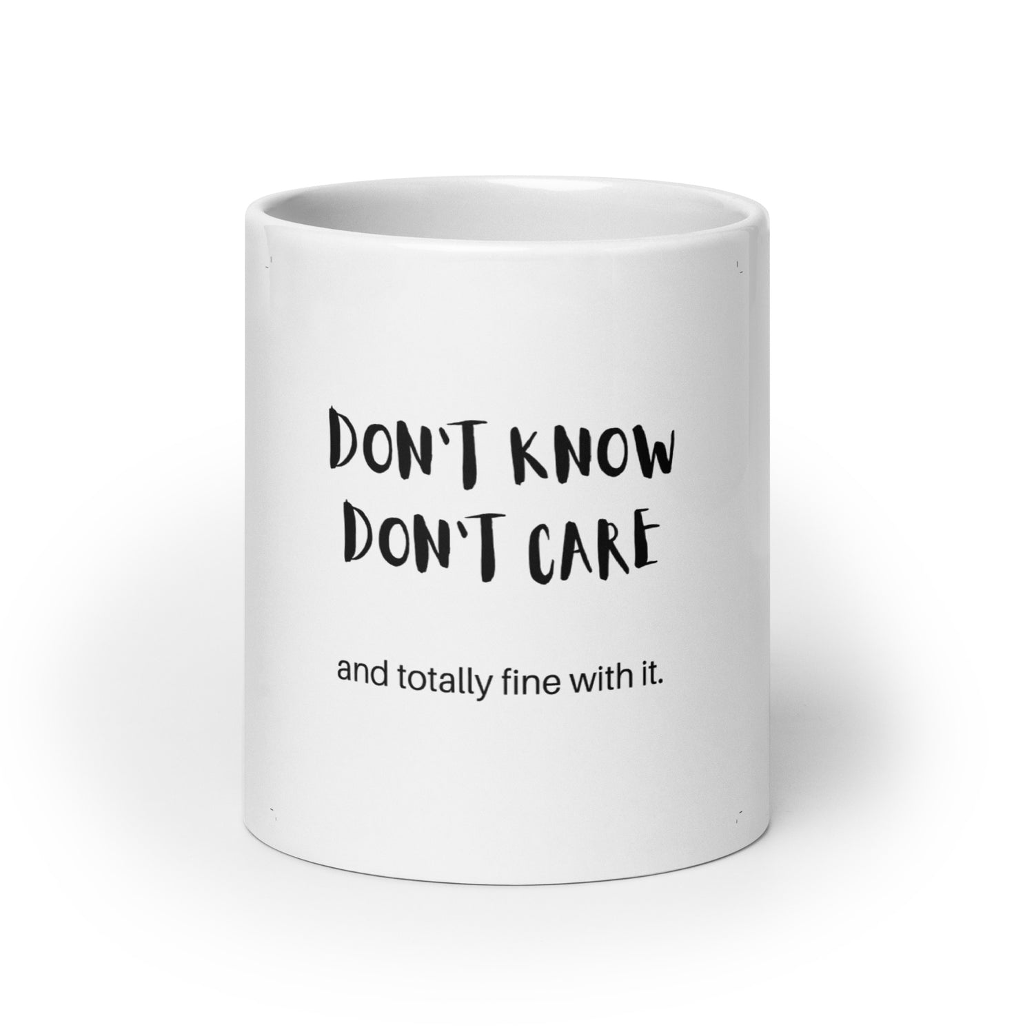 Embrace the art of nonchalance with the "Don't Know, Don't Care" Statement Mug by 100millionartfields. Tailored for the free spirits who float above the fray of daily dramas, this mug is more than a drinking vessel—it's a bold declaration of carefree attitude. Whether you're sipping morning coffee or evening tea, this mug is sure to make a statement without saying a word.
